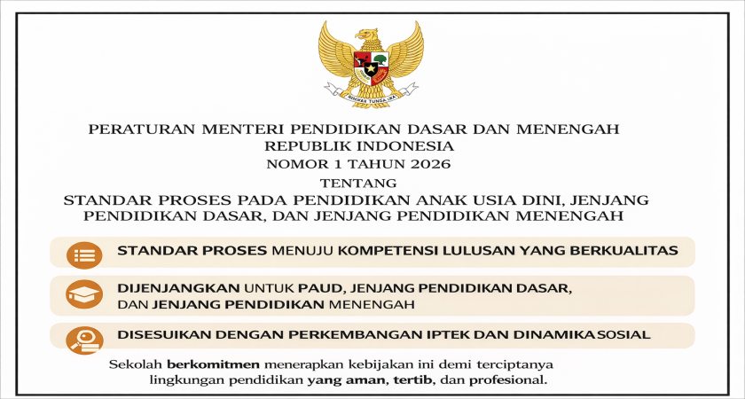 Sekolah mendukung dan melaksanakan Peraturan Menteri Pendidikan Dasar dan Menengah Republik Indonesia Nomor 1 Tahun 2026 tentang Standar Proses pada Pendidikan Anak Usia Dini, Jenjang Pendidikan Dasar, dan Jenjang Pendidikan Menengah sebagai pedoman dalam penyelenggaraan pembelajaran.